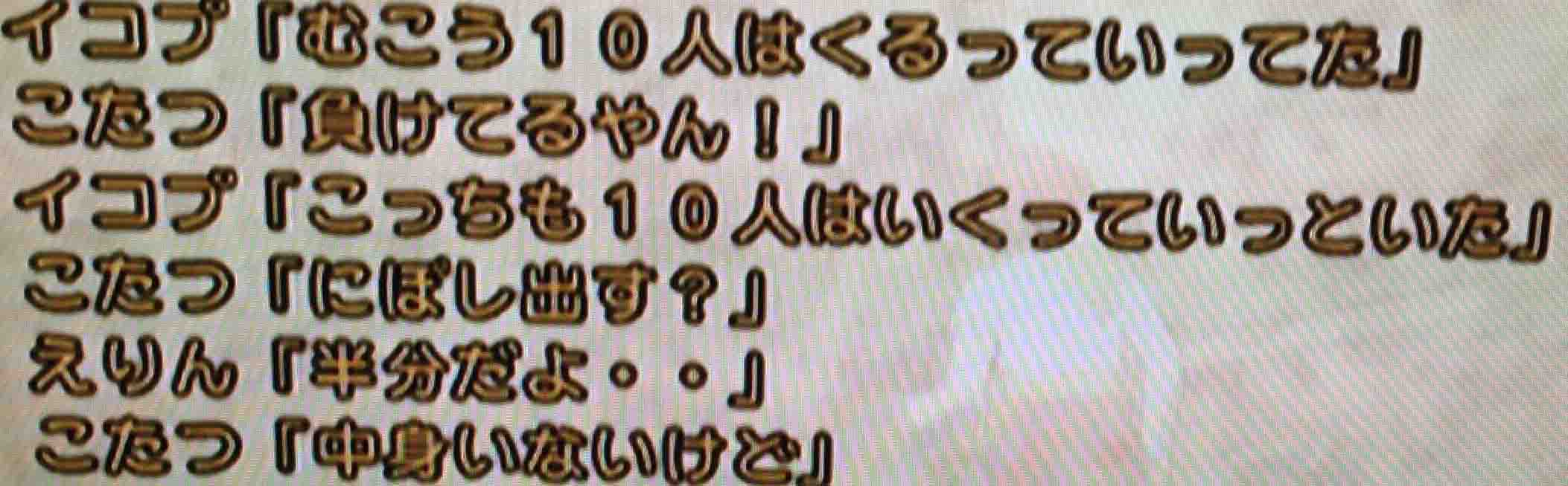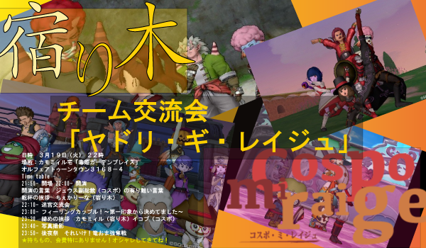 この交流会は「チーム同士でお互い初めての人と仲良くなってフレンドを増やして友達の輪を拡げよう^^」というとてもハートフルな親睦会を謳ってはいますが、しかしそこはドラゴンクエスト。魑魅魍魎たるプレイヤーたちが跋扈するオンライン・ゲームです。「行ってみたら宿り木が全員アフロだった」とか、「チームで劇団四季も真っ青の劇をやれるようにしてきました見てください」とか宿り木の底力を見せつけられる可能性もあります。そのパワーに負けて「ちょ俺今日から宿り木コスポよさらば」とか造反者が続出、気づいたら(イコプ コスポ・ミ・レイジュ 1/1)みたいな自体もあり得ます。き、危険すぎる。これは交流会というオブラートに包まれた戦争に他ならない!!