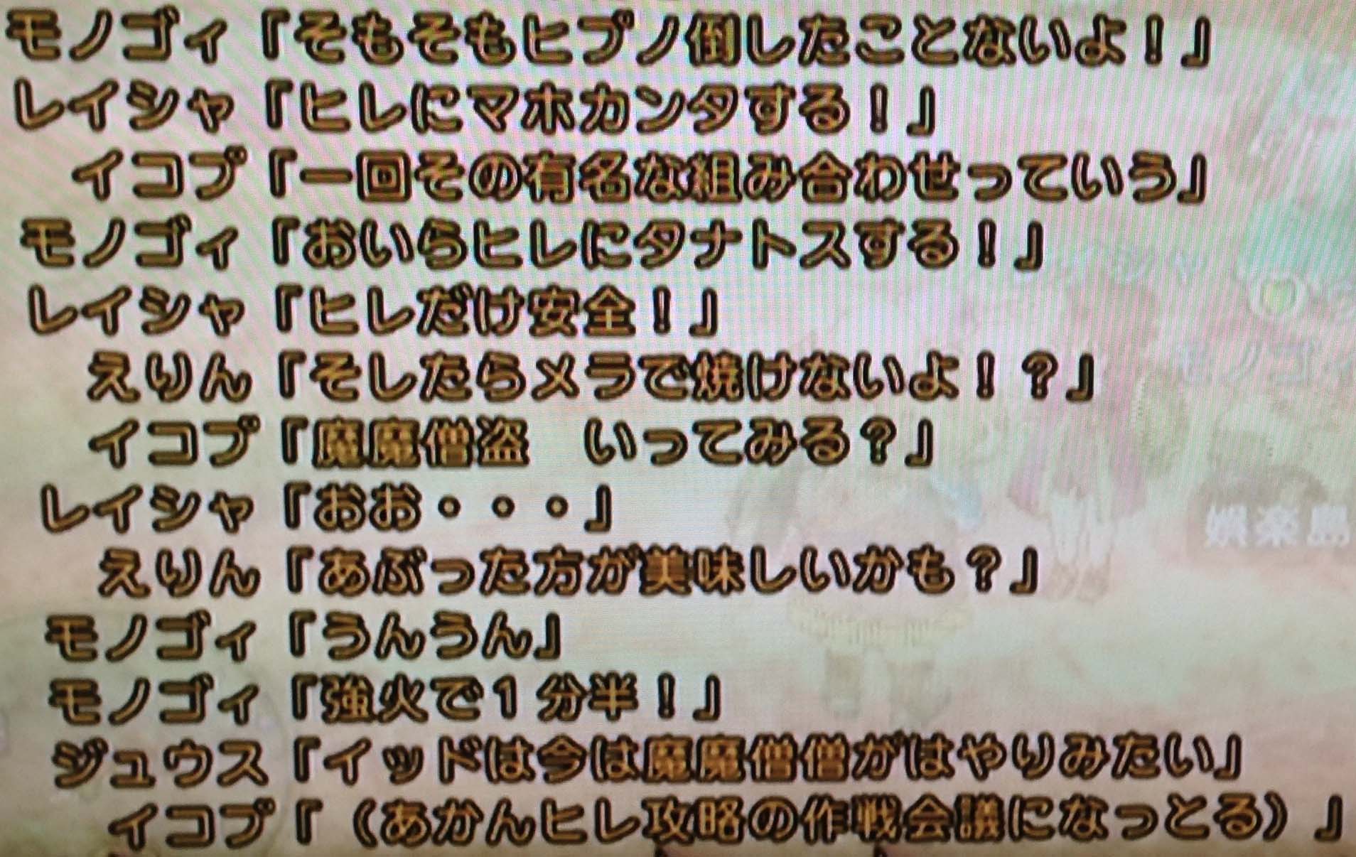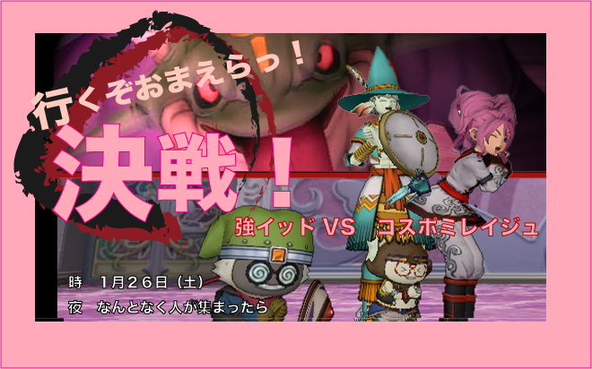 暫く前から、我らがチームコスポミレイジュにも「そろそろか」という気運が高まりつつあった。何百時間という時間を共にした俺たち。俺たちは強いという自負と誇りが育て上げた強い思いと、「でももし勝てなかったら?」という不安が混ざらぬ油と水のように滲んでいた。強ボスという存在が心の奥に重しをのせているようで、最近のみんなはどこか緊張しているようだった。
