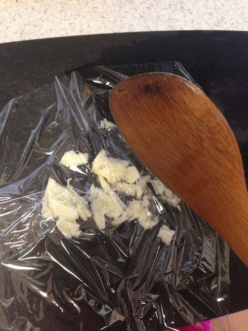 まずまな板ににんにくを一片おいて、ラップをして木べらとかなんか固いものでニンニクを粉砕します。結構な音がしますので、となりの家から壁ドンされるかもしれませんが、そこはごめんんね、本当ごめん!と思いながら頑張りましょう。