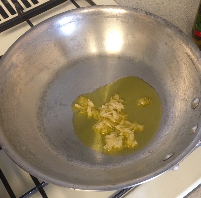 フライパンにオリーブオイルを適当にいれて、にんにくをいれます。