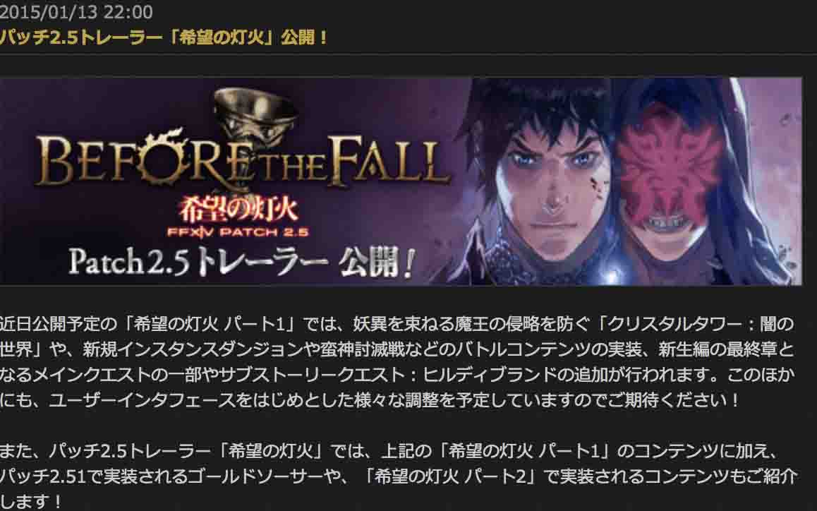 まずビフォーザフォール希望の灯火というこのタイトル。ビフォーザフォール。フォール、そうですね、秋です。秋の前ですね。つまり夏です。今完全に冬ですけど、流石FF、もう夏を意識に入っています。夏どころか軽く秋を見越しての夏ですからね、これはもう先見バリバリでしてエオルゼアの長期計画的な凄さを感じますよね。希望の灯火に関しては、まあ適当に雰囲気のある言葉を選んだ感じがありますがそこは今後バージョンアップを重ねていくうちにストーリーに何か絡んでくるんでしょうね。盟友みたいな感じでね。これまでのメインストーリー、そう、魔王?はいないと思いますけど、なんかこうセフィロスみたいなボスいたじゃないですか、たぶんいたと思いますだってFFですからね。それの次のボスみたいのが来るんですよきっと。なんたってFFですからボスもおそらく人型。それでクリスタルをね、こう、ねじ込むてきな、かんじで。クリスタルが凄い力を持ってるからそれを生かしてこう世界が動く的なね、そういうストーリーだったじゃないですかパッチ2.4までは。それが今、一気に変わります!夏を目前に!クリスタルが変わる!ねじ込み具合が俄然変わってきます!そう、そういう目で見てみるとこの二人の人の右側、顔が凄いことになっちゃってるじゃないですか。何かぐわーって紅い刻印みたいなのねじ込まれてる。これが希望の灯火ですよ。まあそういうストーリーになってくるわけですなあニンニン。