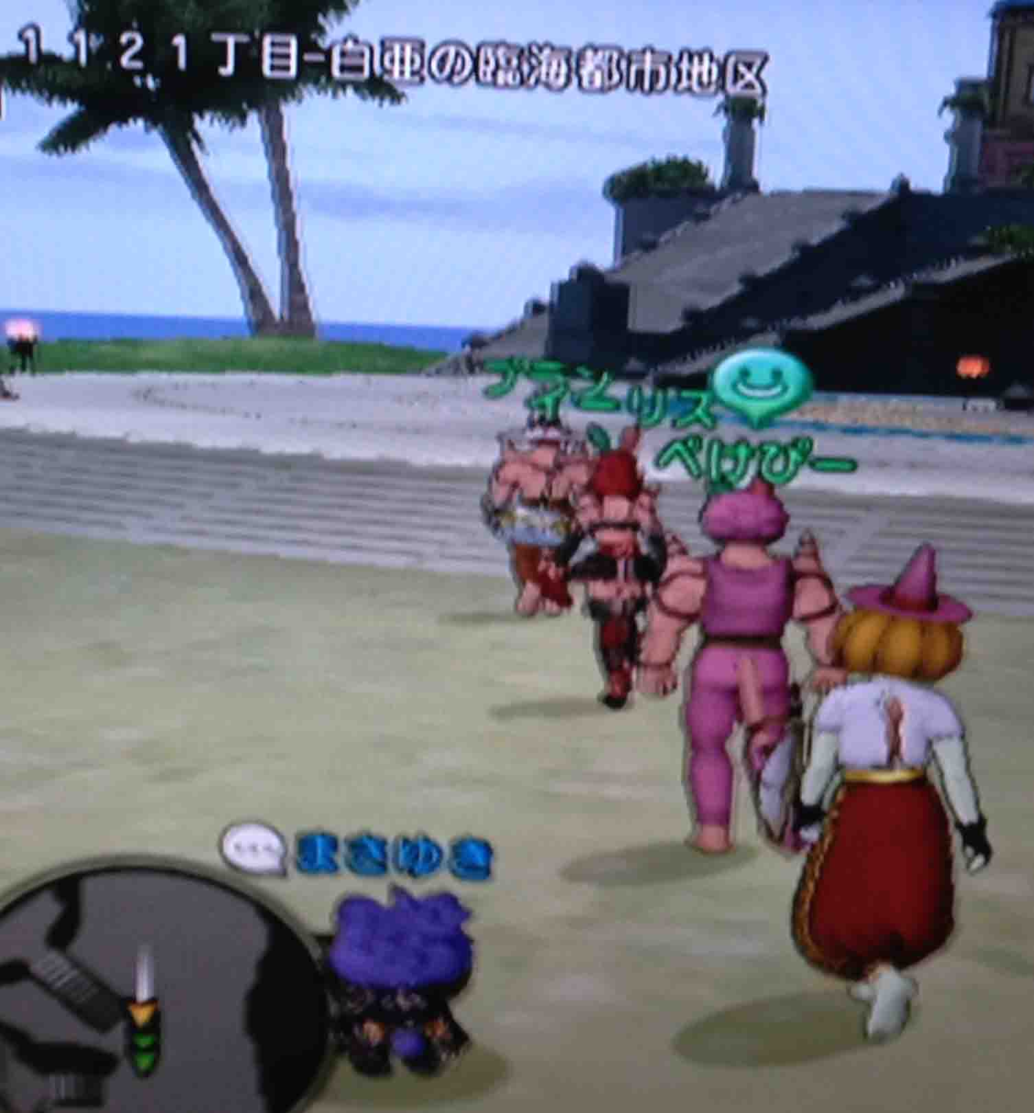 30先生のフレンド集会とやらに向かうことになった我々。先人への敬意を常に忘れない我々4人は、古典的なドラゴンクエストのスタイルを踏襲し、集まった人達に懐郷の念を感じていただこうと、4人1列になって歩いて行くことにした。「ついていく」を繋げることでこのスタイルは可能になる。さあ行こう、新たな絆を探す冒険に。