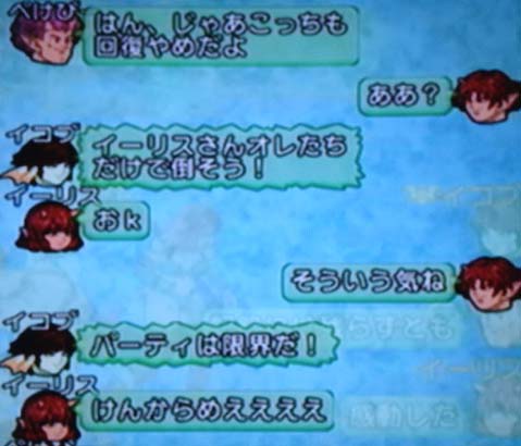 他マップまで出て行ったプランを、しかしあそこにまだいるはずだと信じるように、イーリスは走り続ける。ただ壁にむかって、この壁の向こうにプランがいるはずだと。それはあまりにも悲しい光景だった。泣き叫ぶイーリスを、このままにしておくわけには行かない。俺達は叫んだ。