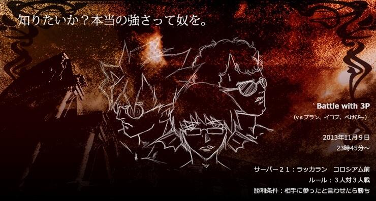さらに単純なシステムの上でのポイント勝負では芸がありません。勝利条件には「相手に参ったと言われたら勝ち」と相手の精神を完全に屈服させることをあげました。是に伴いただ偶然に勝っただけでは勝ちとはみなさない、激しい戦いを経て「お前等には負けたよ、完敗だ、まいった」と晴れやかな笑顔で握手を交わすような、そんなスポーツマンシップの究極到達点的勝利が必要とされるのです。まさに神イベントの始まりです。イコプのイベンターとしての実力が完全に開花した。