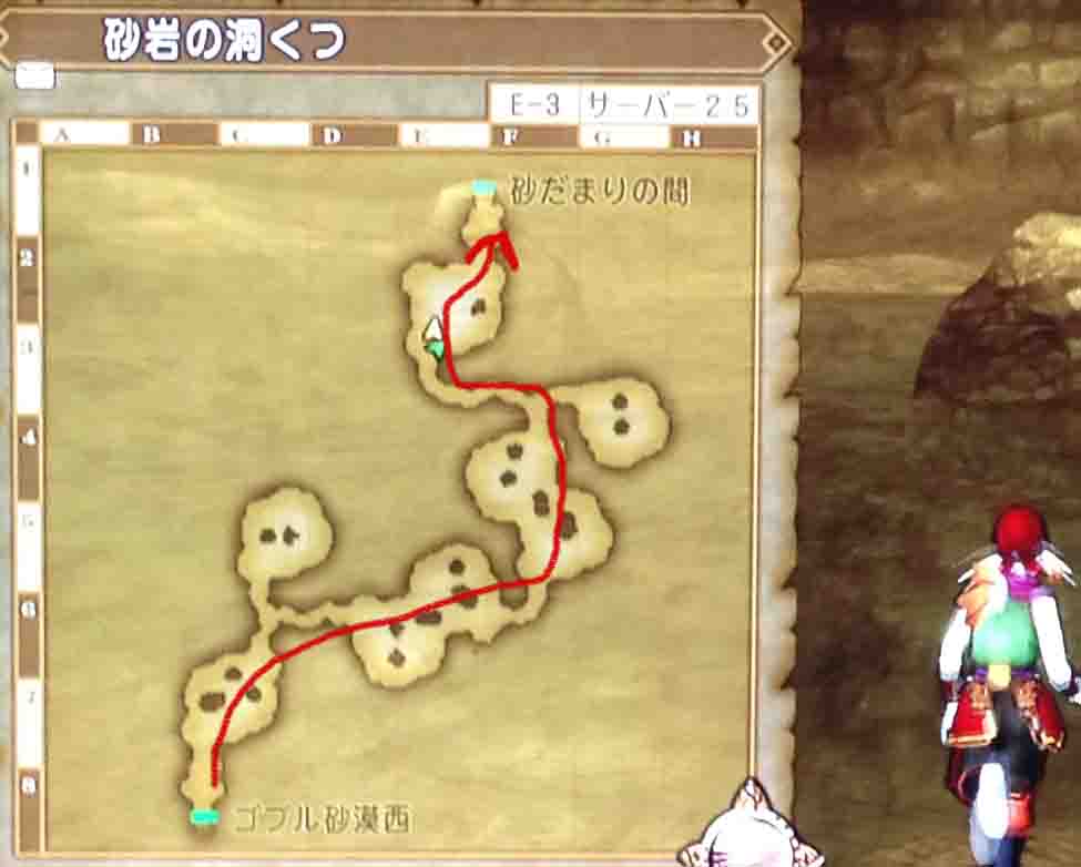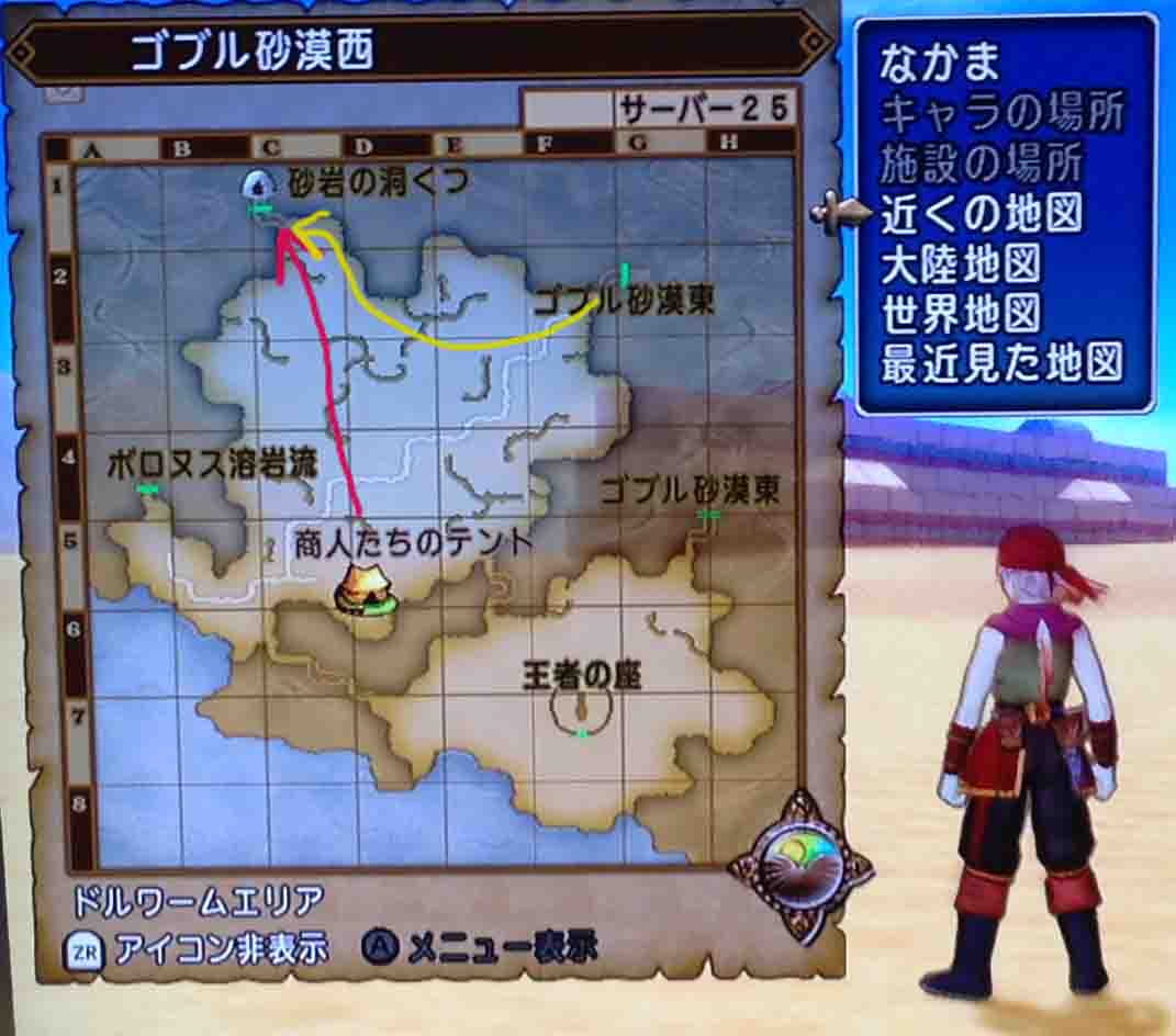 商人たちのテントの石があると楽(赤い線)ですけど、無い場合はドルワーム➡砂漠東➡砂漠西から行きましょう(黄色い線)