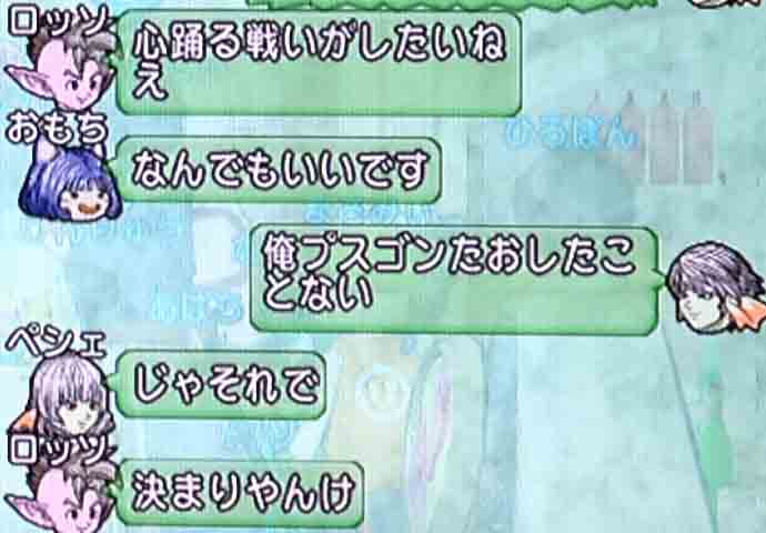 ロッソ、ペシェさんと強ボスでも行こうという話になりまして、誰か後一人誘おうという話になります。だーれーかーいないかなーっおっおもちさんが暇そうにしている!