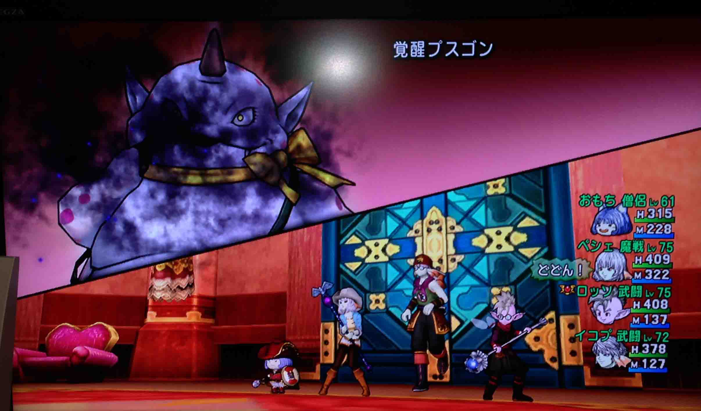 皆さん知らないでしょうが、私は実はツボ練金をしています。何故か、それはもちろん武器を強化するという事に対してただならぬ喜びを感じていたから。なんて見栄をはっても仕方が有りませんね。正直に言います。このペアルックがしたかったからです。ずっと前からこの赤いオーガさんとこうして写真がとりたかった。正直言ってドラクエをここまでやってきた理由の9割がこれです。この写真を撮っているとき、恥ずかしながら私は泣いていましたね。画面の前で。びっくりするかもしれませんが、号泣ですよ。号泣。大人の男がテレビの前で号泣。そのくらい嬉しかったんですよこのペアルック。やってやったなあ、俺。