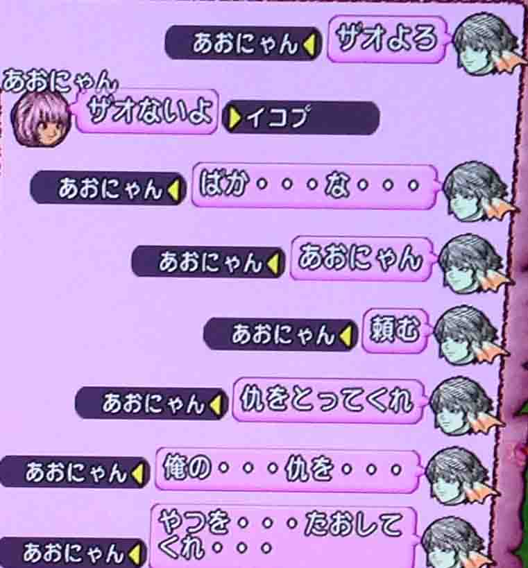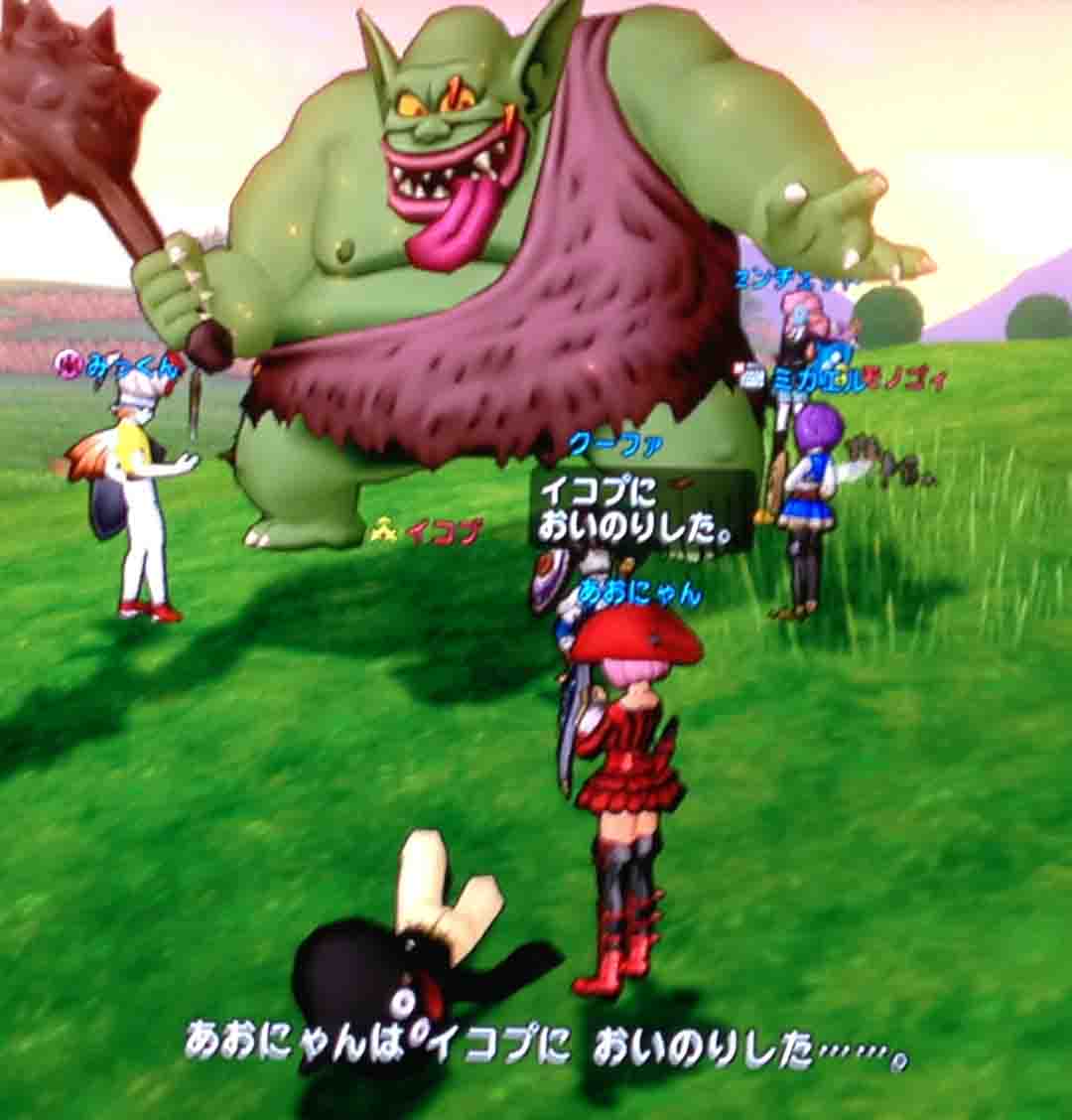 事前にイコプさんが言っていた言葉が思い出された。その、大事な開幕で。この場合、俺はズッシードをすればいいのか?それとも、ザオ係の俺が蘇生に走るのか?でも、プランさんまで死んでしまったら、もう壊滅じゃー。頭の中に、数多の選択肢と、寸後に待ち構えている最悪の場面が一瞬にして爆発し、こーてんは固まった。手が震えて、動かない。準備してきたのに。今日のために、一生懸命、みんなで。狭まる視界の中で、獰猛な鼻息を荒げる、バズズと目が合った。殺意を混めた目線が、一直線に自分を貫いていた。駄目だ、殺される。勝てないー