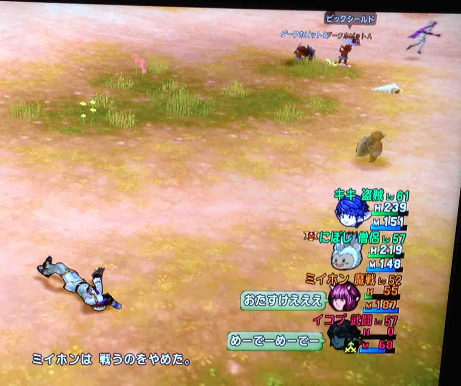 バズズ戦始まって3ターン目くらいでしょうかロッソ(僧侶)が最前線に躍り出るやひょうけつらんげきみたいな事を始めまして「安定してきたら」というさっきのロッソの言葉が脳裏をリフレインする中「ロッソはやくね?」とおずおず尋ねるも「もうやることないんだもの」と一蹴され唇を噛み締めながら大丈夫確かにズッシもスクルトも入ったしここからホイミとか聖女とか色々やろうと思っているそばからモノゴィが死に、ロッソが死に、キャロルが死に、とまさに荒れ狂う乱戦模様。しかし自力がある我々なんとか立て直しというか乱戦のまま撃破しました。