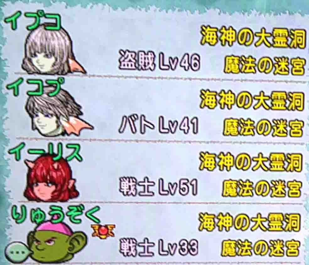 イーリスと、イーリスのサブキャラのりゅうぞく(2アカ)と、イコプと、イコプのサブキャラのイプコ(2アカ)で迷宮に行くことになりました午前2時。