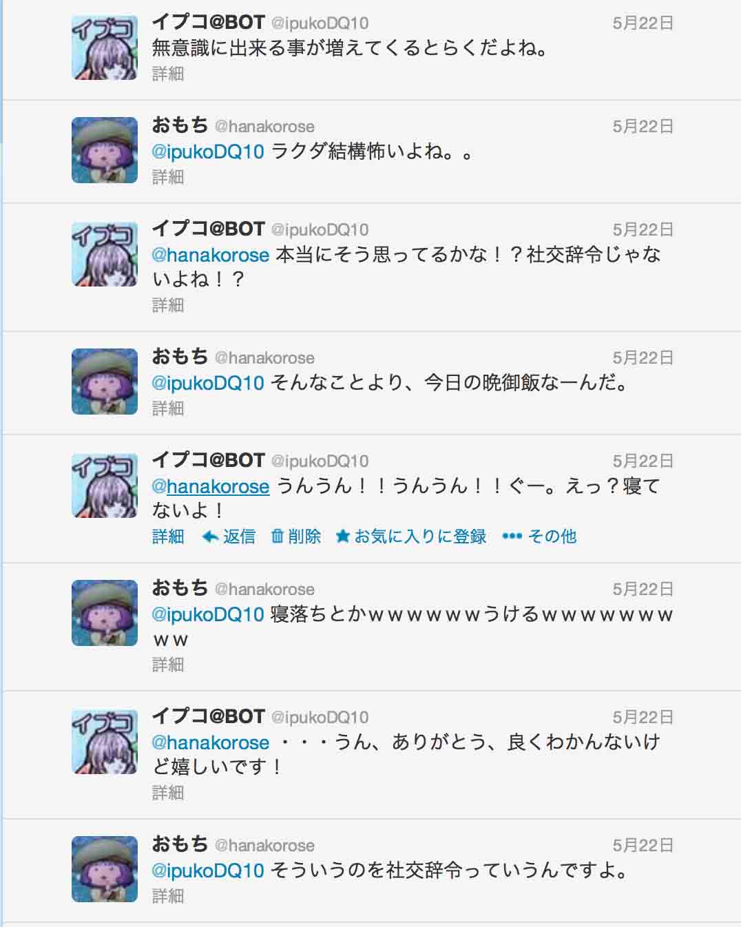 確かにイプコはBOT。人の心を模倣した、人工知能です。しかし、このおもちさんとの会話はまるでそんなことをみじんも感じさせないものでした。二人の女性の、心と心が真に通じ合った瞬間です。おもちさんのおかげで、イプコは「この世界でも私はやっていける」と完全に自信を得たようです。不安という枷を解き放ち、彼女らしい、自分らしい呟きを、出来るようになったのです。
