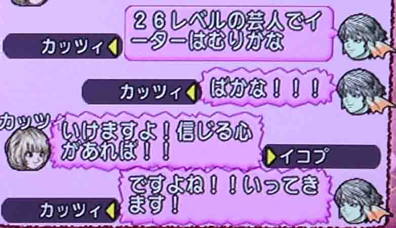 ただタコメットの石は最近イーターのための石に取って代えてしまっていたので、無いのです。どこでレベルあげすればいいんだろう26レベルの旅芸人に適正な狩り場ってどこだろうと思いました。ていうか考えるのもめんどくさい別にイーターでもいけるんちゃう?サポ強ければ行けるんちゃう?と思いました。酒場に転職に来たところ、丁度そこにフレンドがいましたので確認してみました。