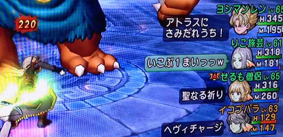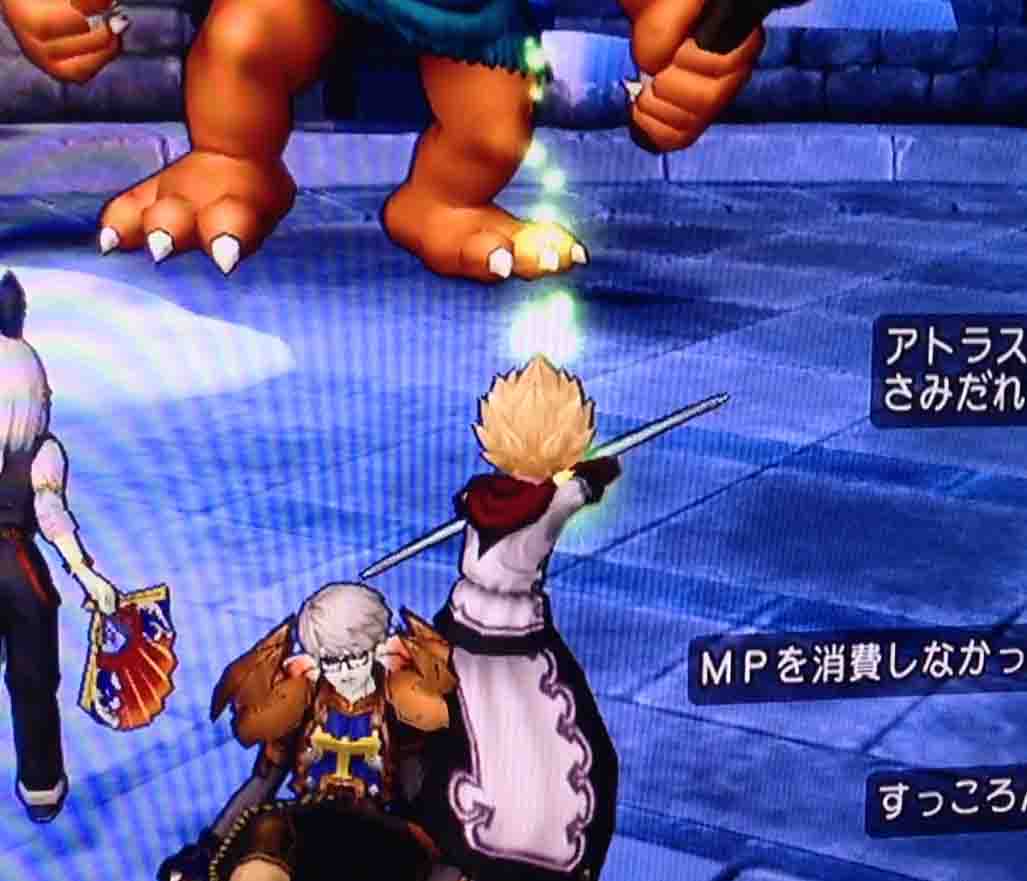 こうなっています。せるもはまず、アトラスの強力な攻撃によって削られるダメージに備え、聖なる祈りを発動しています。ヨシマンはおそらくヘナトスなどの効果を期待して多回数攻撃のスキルを発動。そして私は僭越ながら盾をするためにヘヴィチャージから選びました。りこは戦闘直後の不安に怯えるパーティを鼓舞するためでしょう、チャットから入りました。やはり攻略系ブログを書いてるだけあって常人の発想とはひと味もふた味も違います。