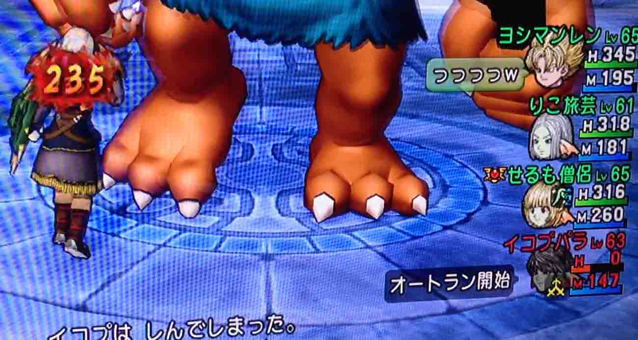 ヨシマン氏は戦闘中に転びガードの足装備を持っていたことに気づいたようで、装備かえていい?wwwと興奮されていました。戦闘前に気づくべき、というのは初心者の考え方であって、逆にミスに気づいたときに素早く冷静に対処するその判断力が評価されます。むしろのこりの3人は転びガードなど持ってもいませんでした。