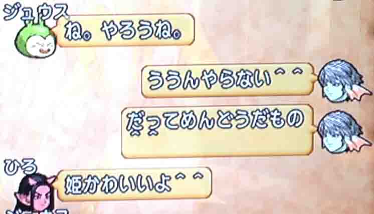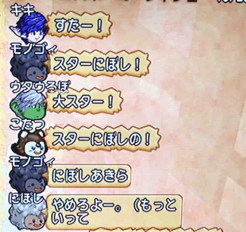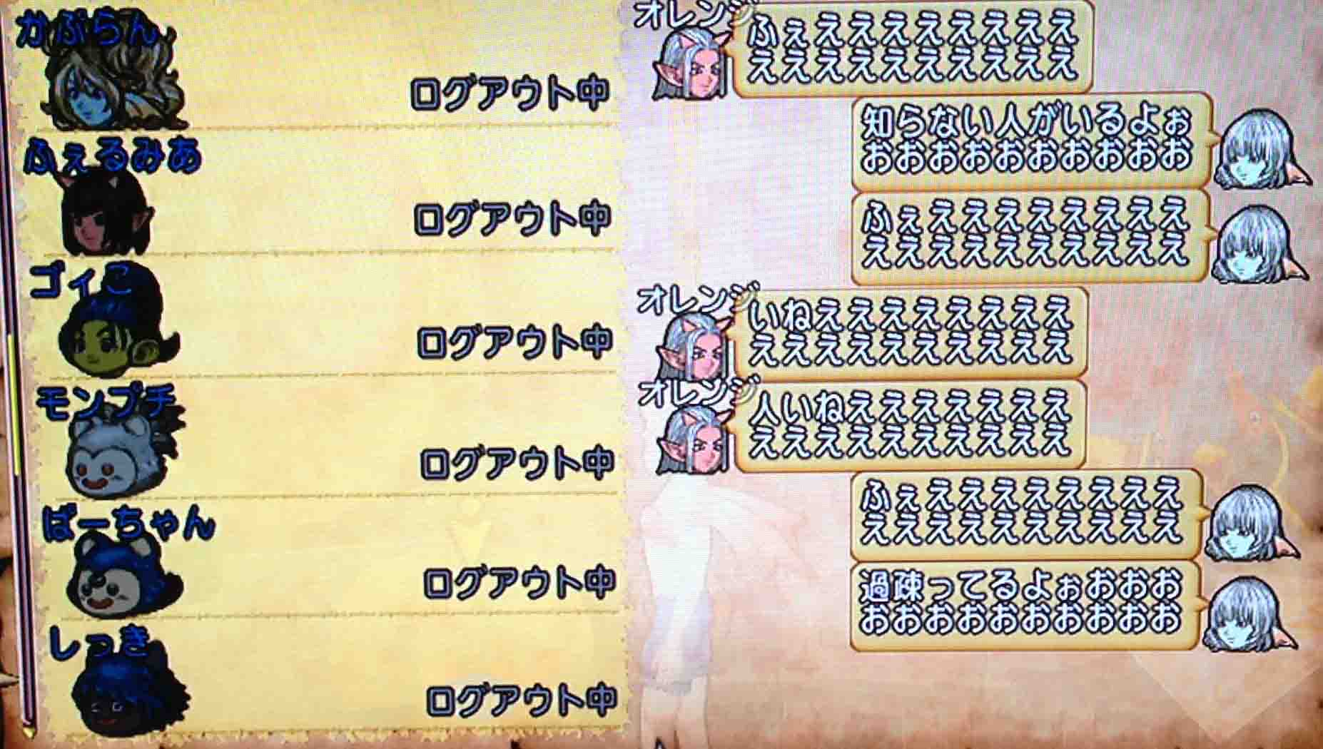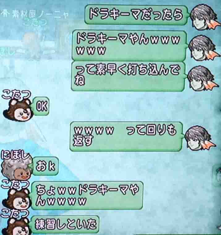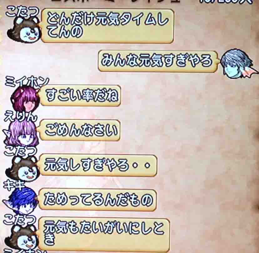 メギストリスで立ってたあおにゃんのところに突撃して「あおにゃんだよー!」「あおにゃんだよー!」「あおにゃんだよー!」「あおにゃんだよー!」「あおにゃんだよー!」と3人で連呼して帰りました。あおにゃんも「あおにゃんだよー!」と言ってました。ドラクエ10史上最高クラスに内容のない白チャットでした。歴史を刻みました。