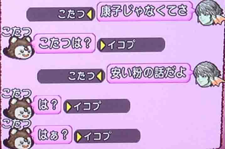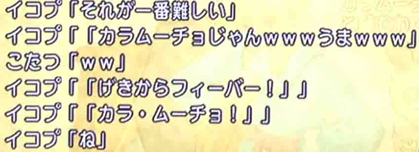 大変有り難いのですが、イコプさんはリアル芸人とかそういう職業のプロの人でも何でもなくてリアルは普通のただのおっさんですのでそんな不可思議な状況に直面したときに「この状況おいしいー!!」とテンションが超絶あがって大喜びでキーボードにしがみつくわけでもなくですね、「なにこれやばい見なかったことにしよう」とテレビの電源をそっと消そうかと思うわけです。まぁ実際は血の涙とか流しながら、何かしょうもないことを言って「う、うん」みたいな空気になってやっぱり血の涙とか流しながらしりとり始めるんですけどね。いつものことです。