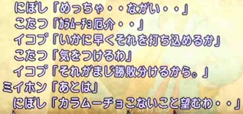 赤文字になるにぼし。れおんが必死で回復する中、俺とひろが雄叫びをあげまくることでぎりぎりの攻防が続きました。強ボス以上の緊張感がありました。